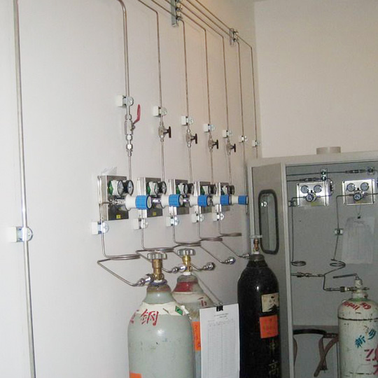 針對腐蝕性、毒性、燃燒性的氣體,通常設計將鋼瓶置于特氣柜(Gas Cabinet)內,再通過管道將氣體供應至現(xiàn)場附近的閥門箱(VMB, Valve Manifold Box),而后再進入制程機臺的使用點(POU, Point of Use),于進入機臺腔體之前,會有獨立的氣體控制盤(GB, Gas Box)與制程控制模塊聯(lián)機,以質流流量計控制器(MFC, Mass Flow Controller)進行流量之控制與進氣的混合比例控制,通常此氣體控制盤不屬于廠務系統(tǒng)的設計范疇,而是歸屬制程機臺設備的一部份。一般的惰性氣體則是以開放式的氣瓶架(Gas Rack)與閥門盤(VMP, Valve Manifold Panel)進行供應。